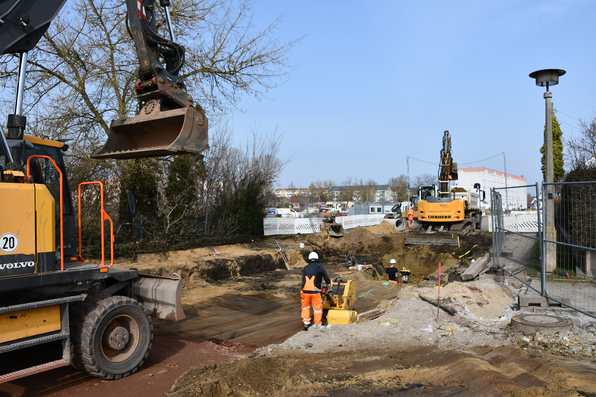 Ist die Fabrikstraße fertig, schließt sich unmittelbar der Kreuzungsbereich zur Schwimmbadstraße an. Er soll bis spätestens Ende Juni fertiggestellt werden. Parallel dazu wird schon seit einiger Zeit auf der Heinrich-Heine-Straße gearbeitet, die vor kurzem auch an der Einmündung zur Friedrich-Ebert-Straße gesperrt wurde.