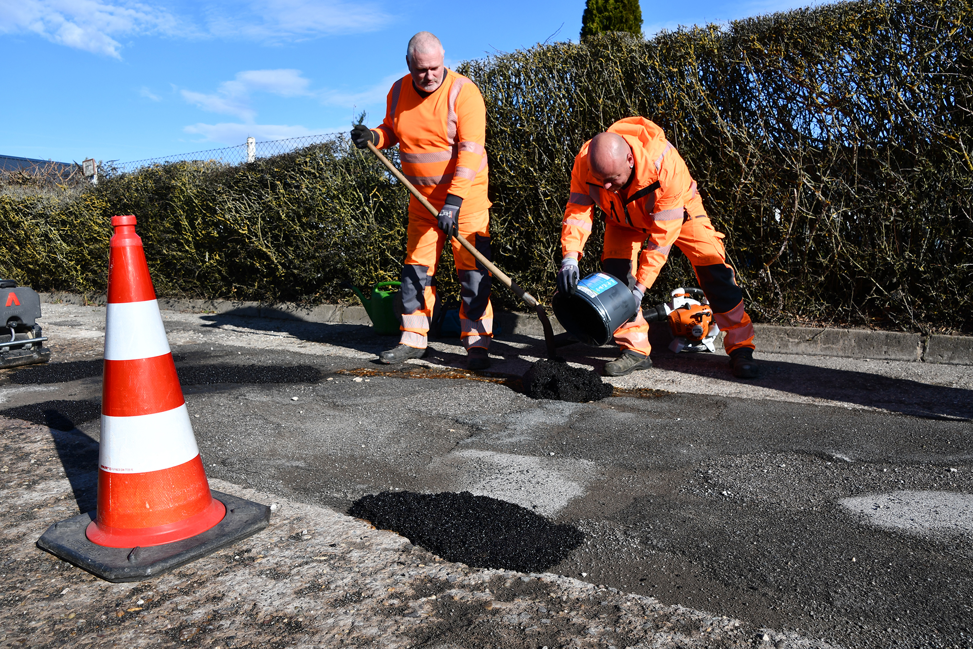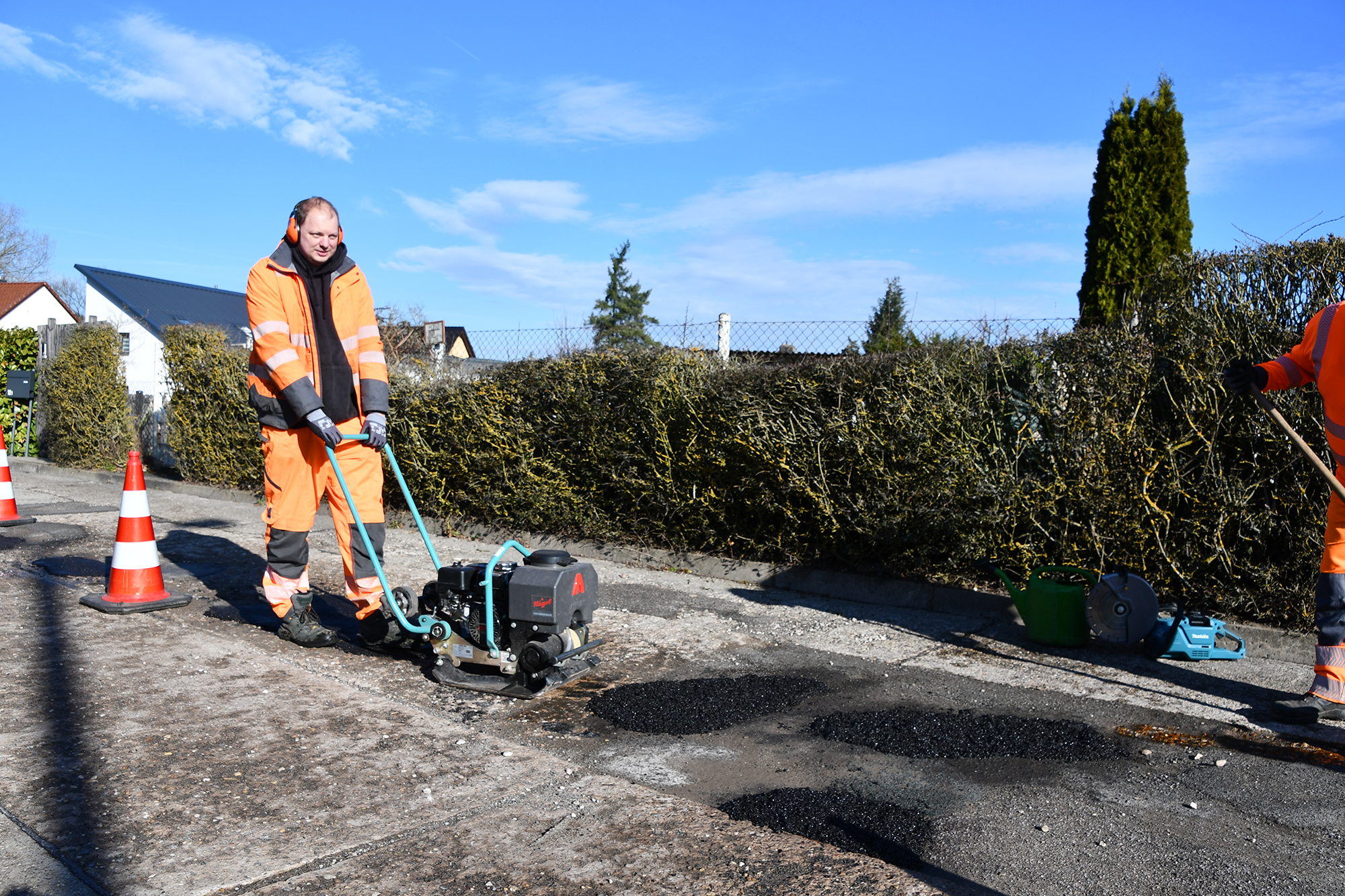 Die Beseitigung von Schlaglöchern gehört zu den ganzjährigen Aufgaben der Bauhof-Mitarbeiter. So kontrolliert ein Team quartalsweise mindestens einmal den Zustand aller Verkehrsanlagen. Dabei werden sämtliche Schäden aufgenommen – seien es Schlaglöcher, defekte Verkehrszeichen oder andere. Dann werden die Beschädigungen schnellstmöglich beseitigt. Nach der letzten Winterperiode treten um ein Vielfaches mehr Schlaglöcher auf, als sonst üblich.